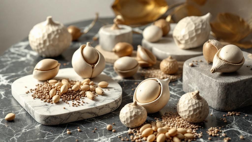 • Ceramic cocoa pods and bronze magnolia seeds convey narratives with clarity and assurance